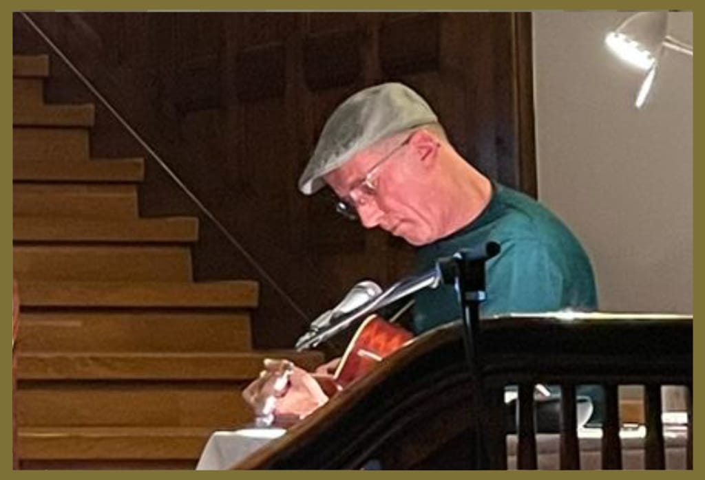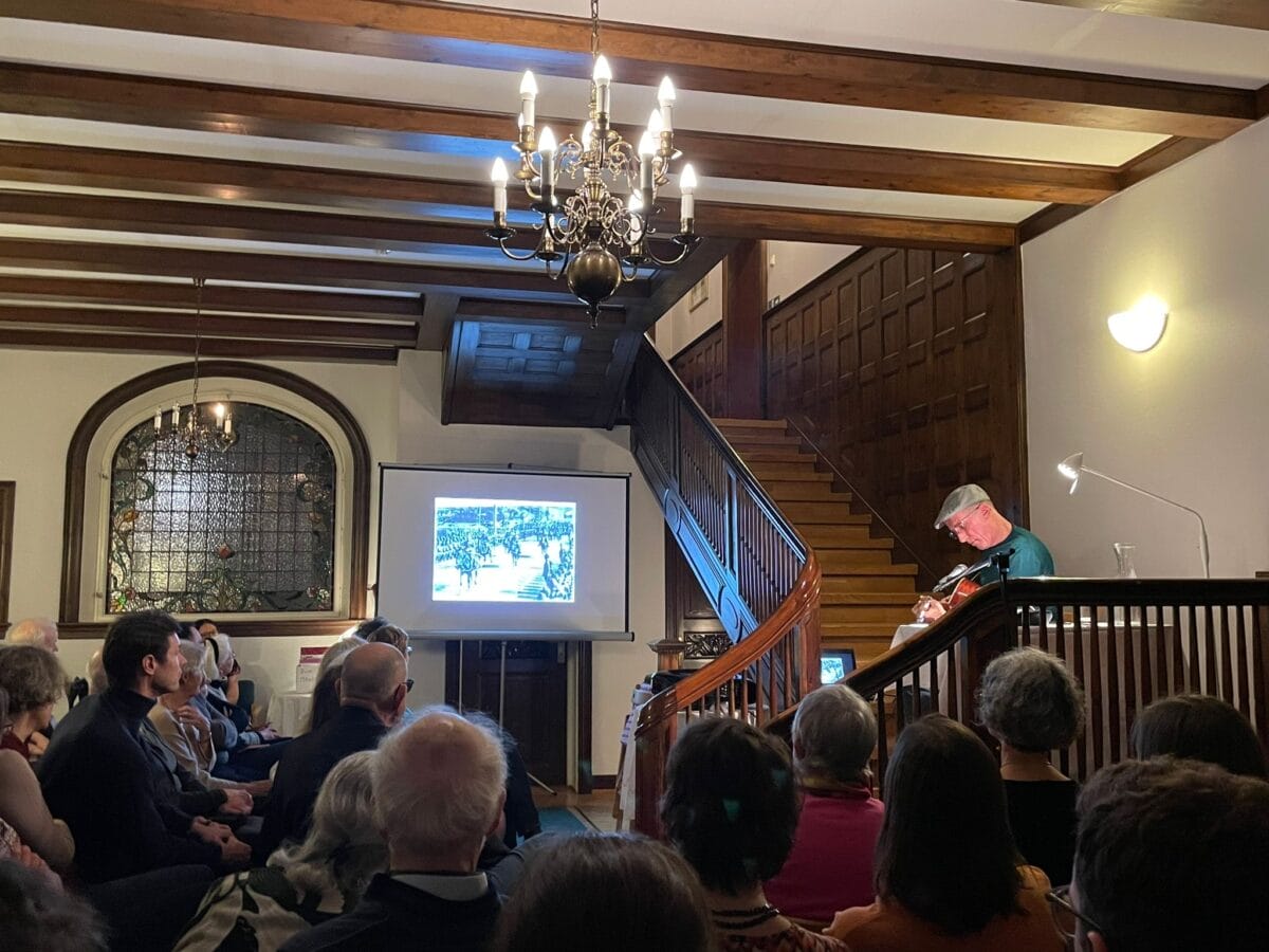 Eine Gitarre beim Literarischen Salon? Warum nicht? Den 85. Literarischen Salon an der ÖB Oslo gestaltete Hans Platzgumer literarisch-musikalisch.