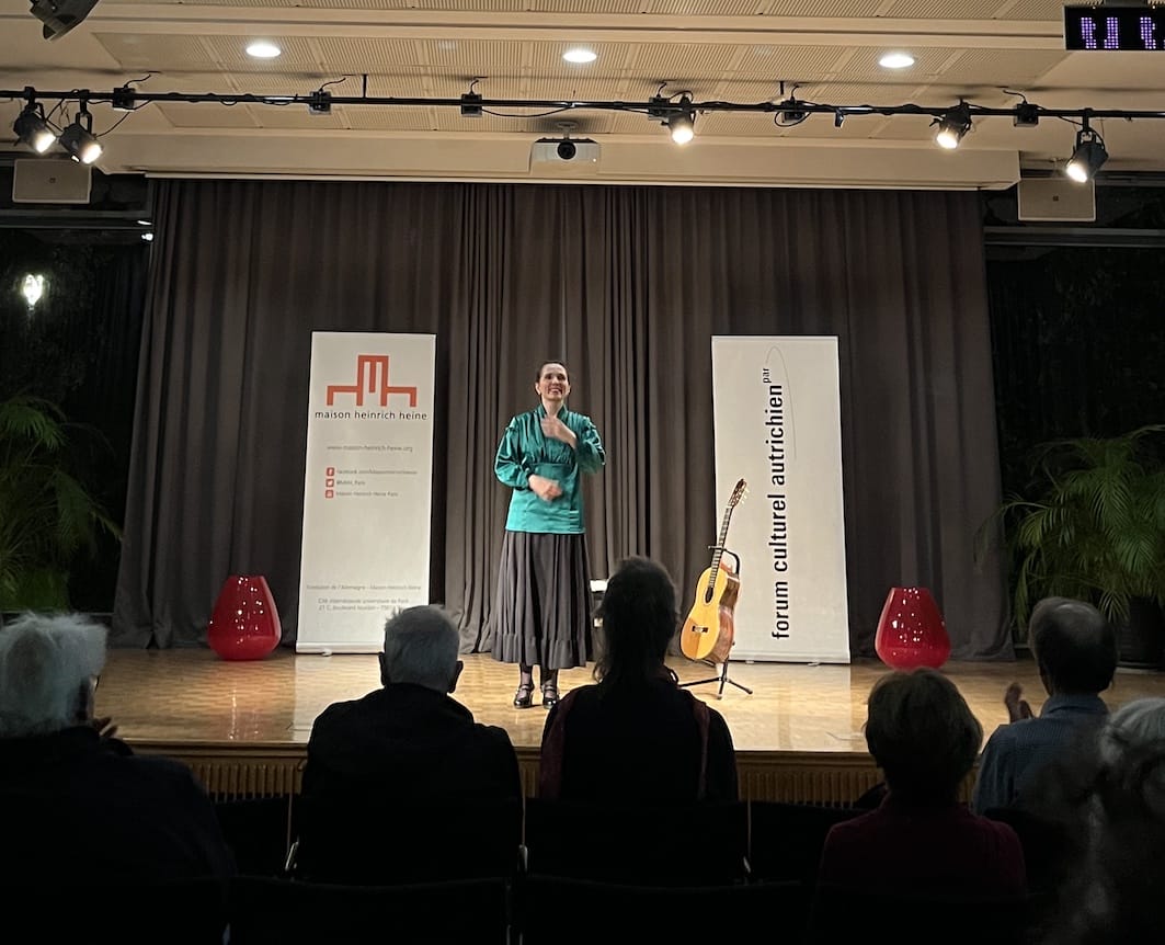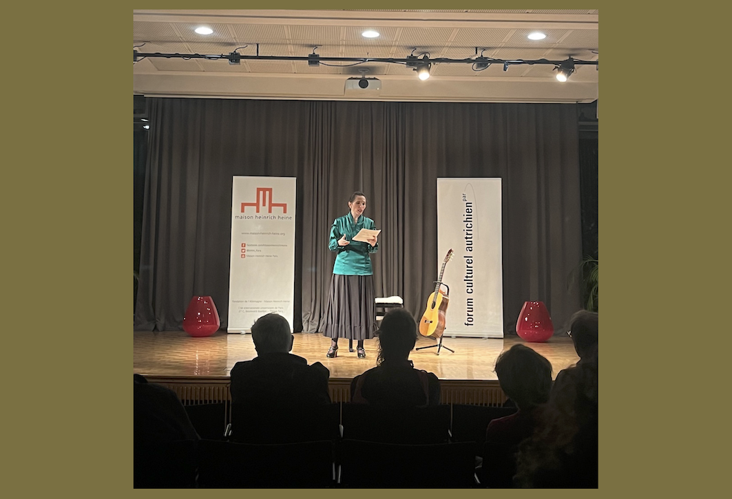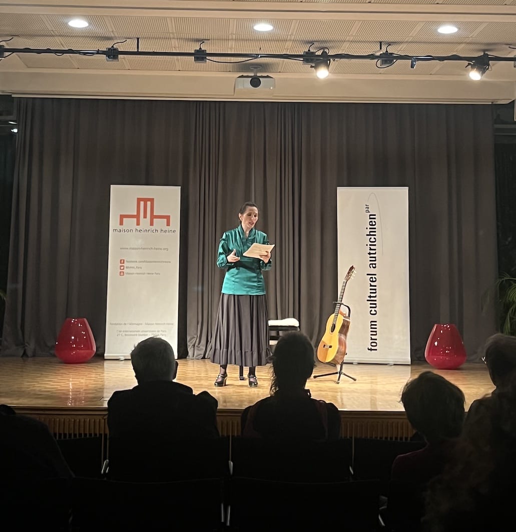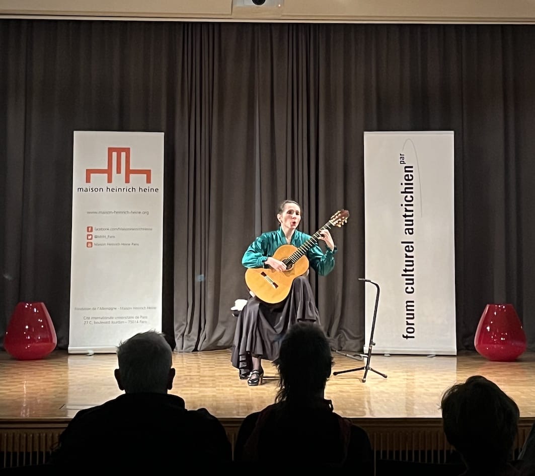 Am 17. Oktober veranstaltete das Österreichische Kulturforum in Paris im Heinrich Heine Haus einen musikalisch-literarischen Abend anlässlich des 50 Todestags Ingeborg Bachmanns. Zu Gast war die Künstlerin Johanna Beisteiner. Die Konzertgitarristin widmete sich in ihrem Soloprogramm der Verbindung von Ingeborg Bachmann zu Paris und ihrem Frühwerk bis 1960 sowie deren Beziehung zu Paul Celan. Johanna Beisteiner rezitierte die französischen Übersetzungen des Briefwechsels zwischen Bachmann und Celan. Mit klassischer Gitarre und Gesang trug Beisteiner dazu Werke von Franz Schubert, Wolfgang A. Mozart und Ludwig van Beethoven vor.